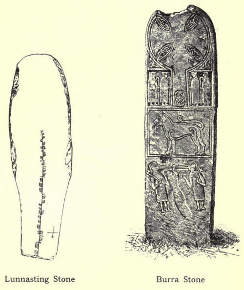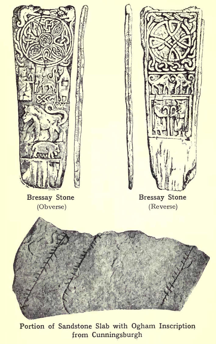 Inscribed or sculptured stones are of two kinds—Celtic, and Norse or runic. Examples of the Celtic are the Bressay Stone, the St Ninian Stone, the Lunnasting Stone, with Ogham inscriptions, and the richly sculptured monument found in Burra Isle. These