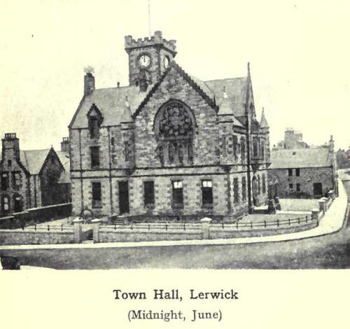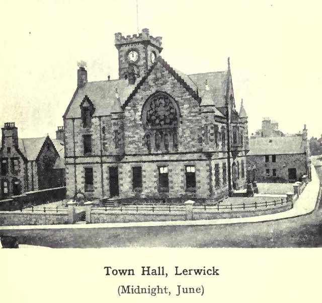Lerwick is the Town Hall, a handsome Gothic building, erected in 1882. Its external decorations include the arms of the town and of the nobles who were connected with the government of Shetland. The main hall is the chief centre of interest. Its beautiful stained-glass windows present a magnificent series of pictures representing the history of the islands from the time of the Norwegian conquest to James III of Scotland, who married Margaret of Denmark.