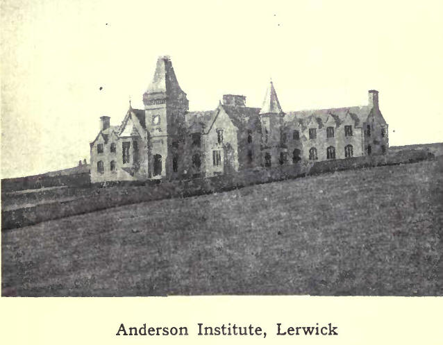 Anderson Institute is a Hostel for country girl-bursars attending the Institute. This handsome building, the gift of Robert H. Bruce, Esq., of Sumburgh, is the first building of its kind in Scotland. Lerwick has two weekly