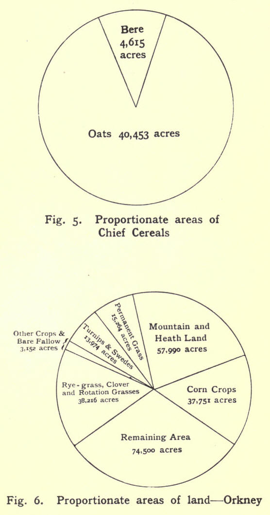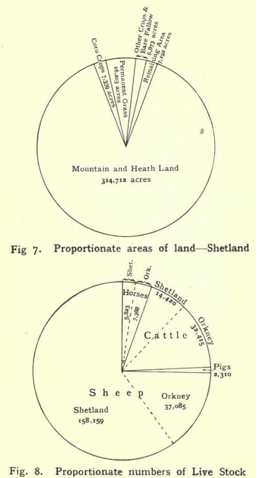 one-half; while bere is grown on 1035 acres. Potatoes take up 2795 acres and turnips the half of that, while ryegrass covers 1067 acres. There are 288,962 acres of hill pasture or "scattald" on which each crofter has the right to graze a certain number of sheep, ponies or cattle.