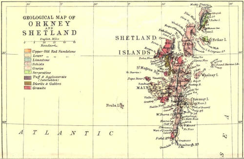 The geological snap shows that metamorphic rocks cover the greater part of Shetland. These rocks are represented by the clayslates and schists that extend from Fitful Head to the Mull of Eswick ; and by the gneiss found from Scalloway to Delting, and also on Burra Isle and Trondra, `Vhalsay and Skerries, Yell, the west side of Unst and of Fetlar, the east side of Northmavine, and the north sea-board of the SandnessAithsting peninsula. Associated with the two series of metamorphic rock are bands of quartzite; while at Fladdabister, Tingwall, Whiteness, Weisdale, Northmavine and Unst are beds of limestone.