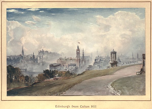 Edinburgh from Calton HillEvery true Scotsman believes Edinburgh to be the most picturesque city in the world; and truly, standing on the Calton Hill at early morning, when the smoke of fires newly-kindled hangs in azure swathes and veils about the Old Town—which from that point resembles a huge lizard, the Castle its head, church-spires spikes upon its scaly back, creeping up from its lair beneath the Crags to look out on the morning world—one is quite inclined to pardon the enthusiasm of the North Briton. The finest view from the interior is obtained from the corner of St Andrew Street, looking west. Straight before you the Mound crosses the valley, bearing the white Academy buildings; beyond, the Castle lifts, from grassy slopes and billows of summer foliage, its weather-stained towers and fortifications, the Half-Moon battery giving the folds of its standard to the wind. Living in Edinburgh there abides, above all things, a sense of its beauty. Hill, crag, castle, rock, blue stretch of sea, the picturesque ridge of the Old Town, the squares and terraces of the New— these things seen once are not to be forgotten. The quick life of to-day sounding around the relics of antiquity, and overshadowed by the august traditions of a kingdom, makes residence in Edinburgh more impressive than residence in any other British city. I have just come in—surely it never looked so fair before? What a poem is that Princes Street! The puppets of the busy, many-coloured hour move about on its pavement, while across the ravine Time has piled up the Old Town, ridge on ridge, gray as a rocky coast washed and worn by the foam of centuries; peaked and jagged by gable and roof; windowed from basement to cope; the whole surmounted by St Giles’s airy crown. The New is there looking at the Old. Two Times are brought face to face, and are yet separated by a thousand years. Wonderful on winter nights, when the gully is filled with darkness, and out of it rises, against the sombre blue and the frosty stars, that mass and bulwark of gloom, pierced and quivering with innumerable lights. There is nothing in Europe to match that, I think. Could you but roll a river down the valley it would be sublime. Finer still, to place one’s-self near the Burns Monument and look toward the Castle. It is more astonishing than an Eastern dream. A city rises up before you painted by fire on night. High in air a bridge of lights leaps the chasm; a few emerald lamps, like glow-worms, are moving silently about in the railway station below; a solitary crimson one is at rest. That ridged and chimneyed bulk of blackness, with splendour bursting out at every pore, is the wonderful Old Town, where Scottish history mainly transacted itself; while, opposite, the modern Princes Street is blazing throughout its length. During the day the Castle looks down upon the city as if out of another world; stern with all its peacefulness, its garniture of trees, its slopes of grass. The rock is dingy enough in colour, but after a shower, its lichens laugh out greenly in the returning sun, while the rainbow is brightening on the lowering sky beyond. How deep the shadow which the Castle throws at noon over the gardens at its feet where the children play! How grand when giant bulk and towery crown blacken against sunset! Fair, too, the New Town sloping to the sea. From George Street which crowns the ridge, the eye is led down sweeping streets of stately architecture to the villas and woods that fill the lower ground, and fringe the shore; to the bright azure belt of the Forth with its smoking steamer or its creeping sail; beyond, to the shores of Fife, soft blue, and flecked with fleeting shadows in the keen clear light of spring, dark purple in the summer heat, tarnished gold in the autumn haze; and farther away still, just distinguishable on the paler sky, the crest of some distant peak, carrying the imagination into the illimitable world. Residence in Edinburgh is an education in itself. Its beauty refines one like being in love. It is perennial, like a play of Shakespeare’s. Nothing can stale its infinite variety.