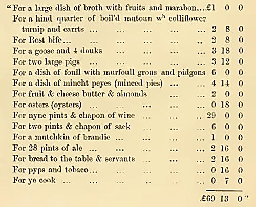The following extracts from the treasurer's book of the Edinburgh Town Council, in relation to the cost of a corporation dinner in October, 1703, may be read not without interest:—