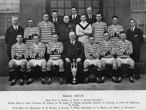 Not the least famous of the fraternal players are the brothers Morton, who threw in their lot with the Queen's Park just before the war. The more famous of the two is A. L. Morton, one of the smartest left-wing players who has ever served the club. The war prevented him receiving International honours earlier, but after its close he at once received recognition from both the Scottish League and Scottish Association. For the former, he played in 1919 in the two unofficial matches against England, 26th April and 3rd May, one against Ireland, 22nd March, 1919 ; and the Association did him further honour by capping him against Wales, 23rd February, and Ireland, 13th March, 1920, and selected him against England, but unfortunately an injury at Dundee compelled him to withdraw. R. M. Morton was a capable centre forward, who did good work for the club until he retired in 1920.