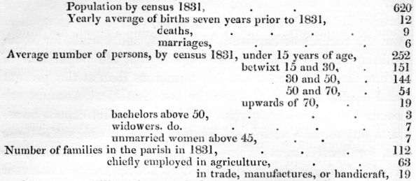 By a very accurate census taken in 1833, the population of this parish was found to have decreased to 485 persons, chiefly in consequence of the -proprietors having ceased working the quarries. Of these, 178 were under fifteen years of age. By a census taken in 1839, the population was found farther decreased to 416.