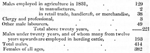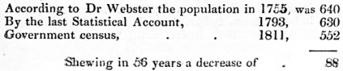 The cause of the temporary decrease was the letting of the lands in larger farms, and discouraging the croft system, in the end of the last century: but those farms having been again reduced and subdivided, and numerous crofts set apart for labourers and tradesmen, the population has increased, and is increasing. There are no villages in the parish, nor any hamlet containing more than twelve dwelling-houses.
