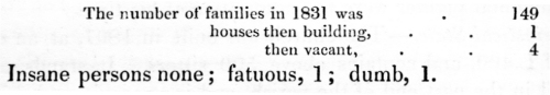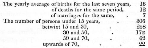 [Since the above statement was written, an excellent addition has been made to the manse. It is now one of the most commodious in the neighbourhood. New offices have also been built. The old school-house having been found too small and uncomfortable, a new one has been erected, capable of containing between eighty and ninety scholars: also a very neat dwelling-house for the schoolmaster. The people, in general, are alive to the benefits of education,—few, if any, being unable to read. Two Sabbath classes are taught by the present incumbent, one before sermon for children between ten and fifteen years of age, the other after, for intending communicants. Public worship is uncommonly well attended, so much so, that the church in summer is found to be rather too small, and additional seats have been erected in the passages for children, and those who have no right to sittings. There are only two families of Dissenters, consisting of six individuals, in the parish. One of these belongs to the Episcopal persuasion, the other to the United Secession church. The parochial collections have been rather on the increase; the average being now between 8s. and 9s. During the last three years about L. 30 has been transmitted to the General Assembly's Schemes; and nearly the same amount to other charitable institutions. Intemperance appears to be on the decrease, and a marked change to the better has been observable of late years among the parishioners. It is rather remarkable that the population has neither increased nor diminished during the last ten years, being the very same by the census for 1831, and that of 1841.]