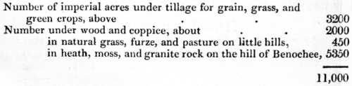 As there have been no actual measurements of the surface of Benochee, which is reckoned a royal forest or commonty, with certain rights, granted by charters to neighbouring properties, the above must be held as only an approximation to the superficial contents of the parish. The valued rent is L. 2300, 13s. 4d. Scots, the real rental not less than L. 3000 Sterling, consisting chiefly of money, with small proportions of farm meal, bear, and oats, by the county fiars, or payable in kind, as minister's stipend, &c. &c. There are five farms let at more than L. 100 of yearly rent, sixteen farms above L.50 yearly, and the rest from L. 20 to L.40 yearly, besides numerous crofts of a few acres, under L. 10. The rate for outfield land varies from 10s. to L. 1 per acre, imperial ; that for old infield or croft land is about L.2 per acre, and some of it above L.3 yearly; and the latter having been enriched (under the old system of tillage), for many years in succession, with the whole manure produced on the farm, is found cheaper than much of the outfield, though let at double or even triple the rent; there being a much greater surplus of produce left for other uses, after paying the higher rent, than from the poor field lands after deducting the lower rent, with seed and labour. The grazing of cattle is rarely charged by the head, but when it is, the expense may be reckoned at 15s. for a year old beast; L. 1, 10s. for a two year old; and L.2, 10s. for a three year old stot, during the five months from June to October inclusive. Grass parks are let principally by the proprietors in the district, who keep many of their fields in perennial grass, which bring from L.3 to L.4 per acre.