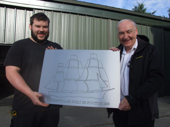 Gavin Gatt (left) and Stanley Bruce (right) with the stainless-steel image of the ‘Thermopylae’. (Photo by Ricky Somerville).