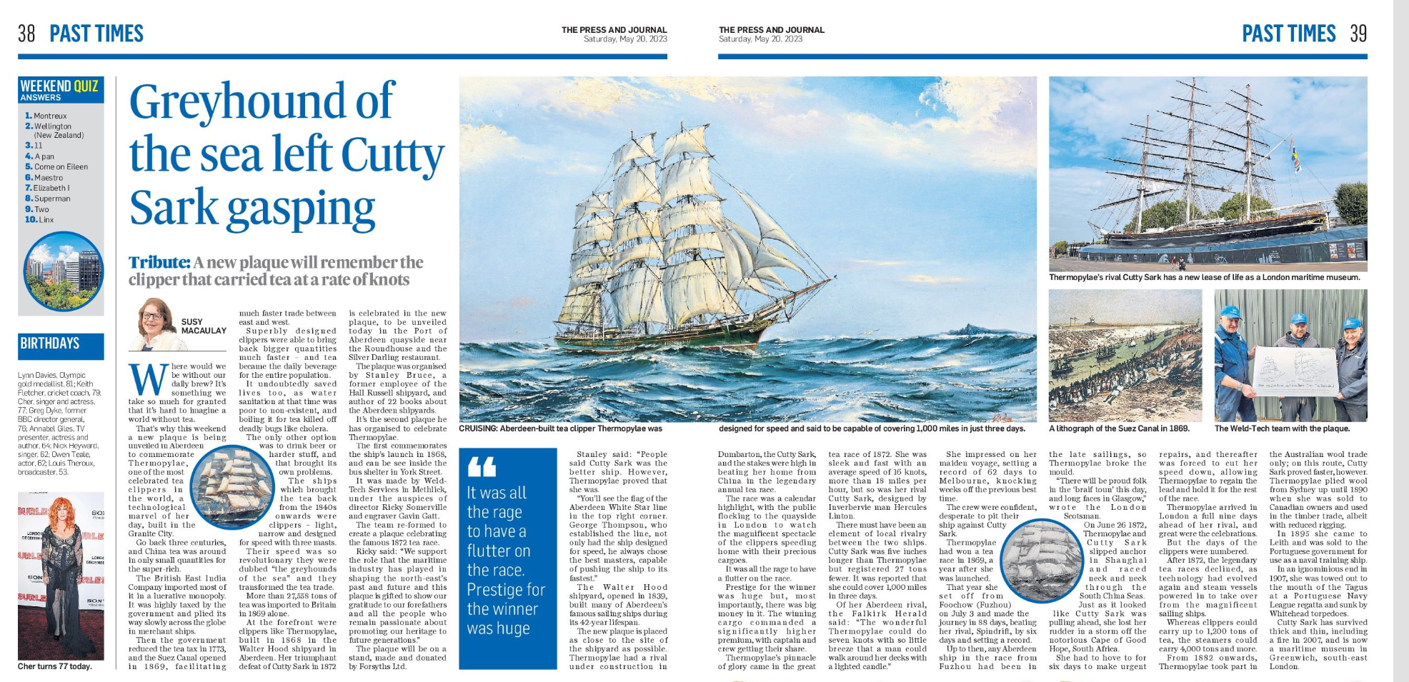 This month marks the 150th anniversary of the launch of the Aberdeen-built Thermopylae, the fastest clipper that ever sailed. Stanley Bruce reports (pdf)