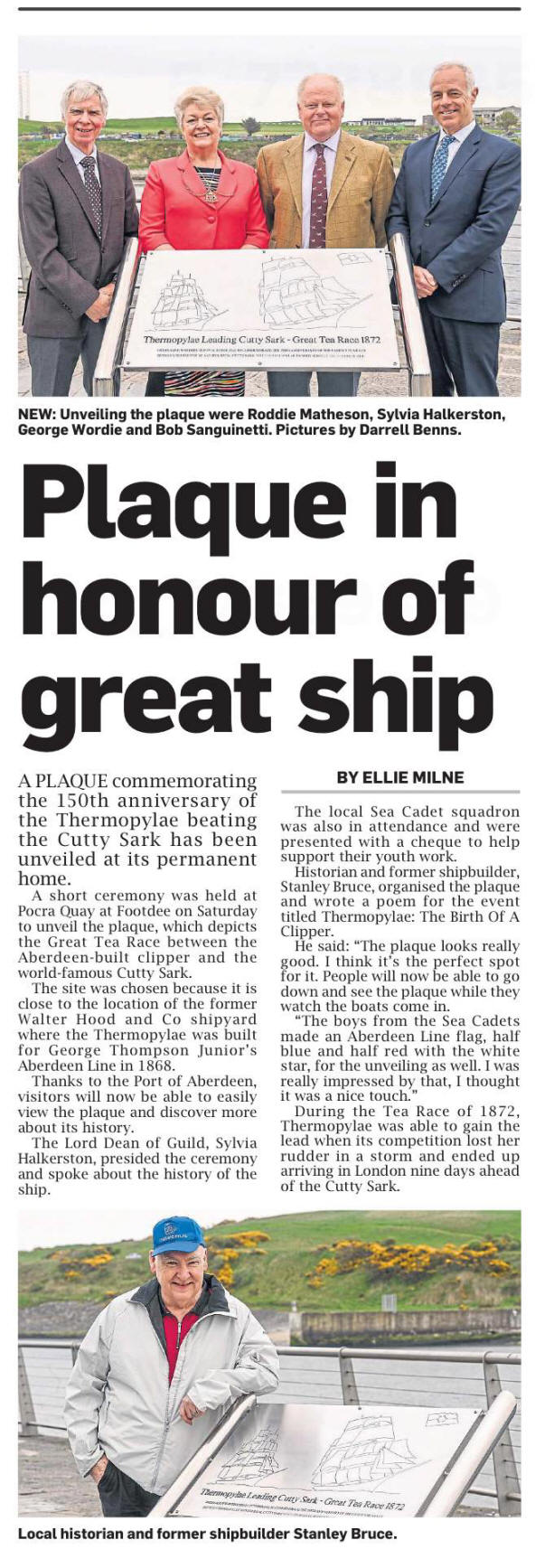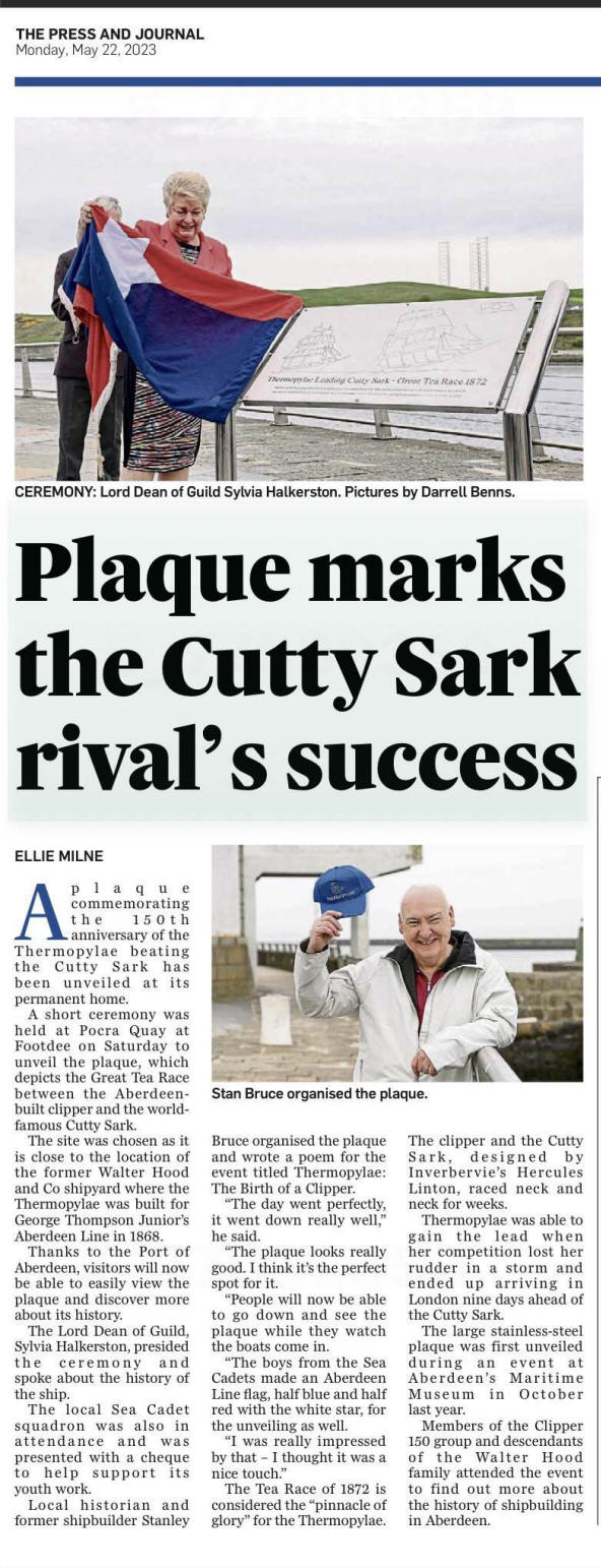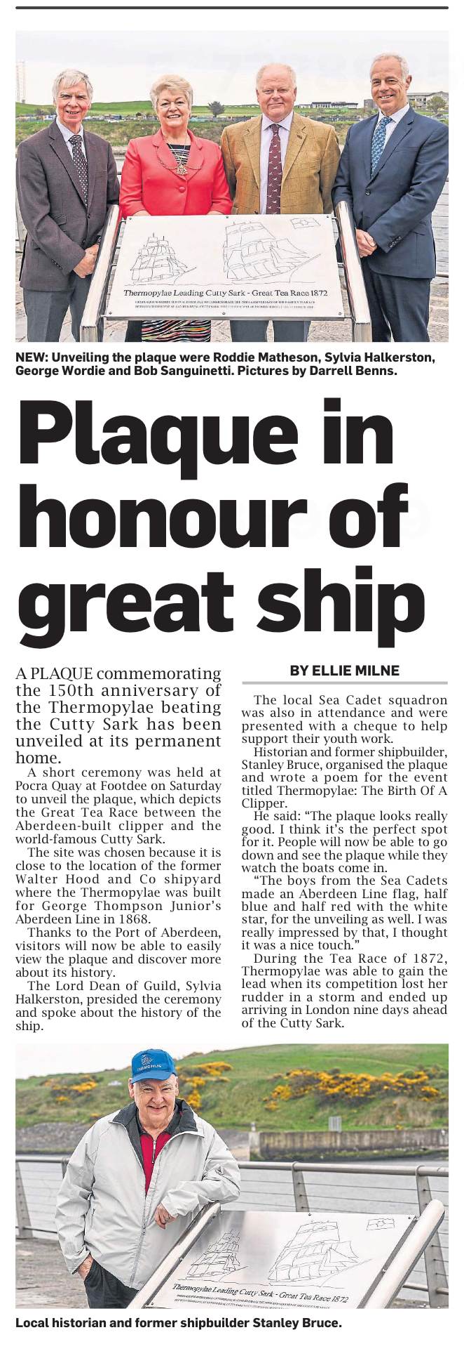 Plaque celebrating 150th anniversary of Aberdeen ship’s success in Great Tea Race with Cutty Sark unveiled