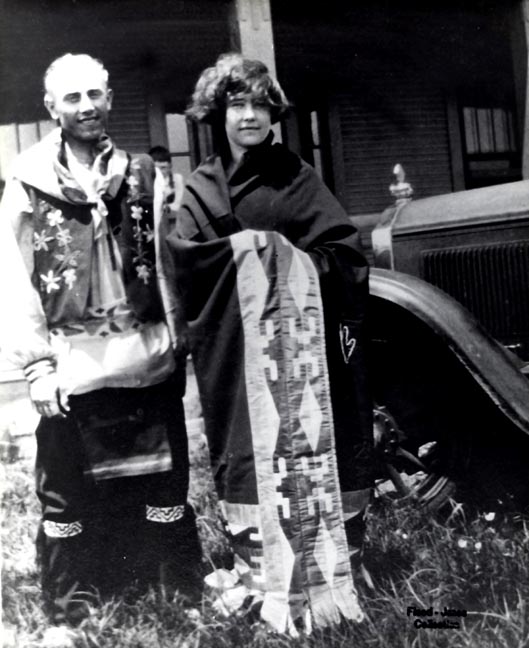 The vest on this bridegroom in this picture is embroidered designs going to the Woodland patterns. His leg bands are of the Faw Faw design. The honor blanket this girl has wrapped around her has a broad strip of Osage ribbon work and this is one of their designs. Their  legends tell that they come from the stars. I find it interesting that this looks like a little space man with helmet and earphones.