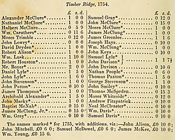 The elders in Timber Ridge, in Mr. Brown’s time, were, Wm. McClung, Archibald Alexander, Daniel Lyle, John Lyle, John McKay, Alexander McCleur, and John Davidson. In New Providence, John Houston, Samuel Houston, James Wilson, Andrew Steel, and John Robinson.