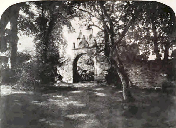 In all probability the Castle was not long in existence before it was added to by being lengthened 30 feet eastwards, as seen on hatched part of basement plan, the addition containing the same number of floors, with the kitchen on the ground floor, which was not vaulted. Two round tall corner turrets at the east gable still remain, as will be seen from the illustration. On the east side there still remains the old entrance gateway, bearing date 1626, and represented on one of the illustrations: the gate or door was secured by a sliding bar. The garden extending to the south is surrounded by old walls: a door lintel in one of these bears the date 1662.