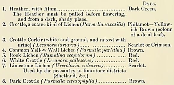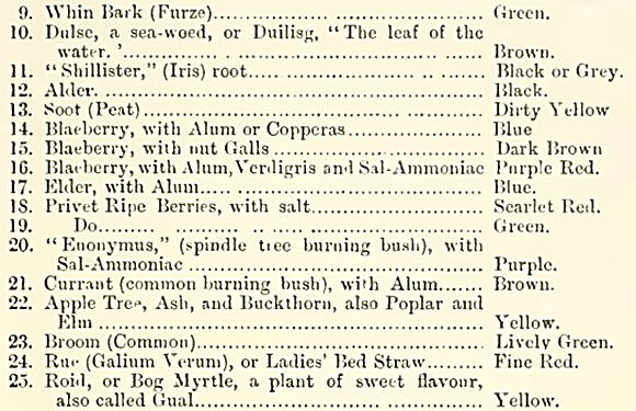 Logwood and Redwood are much in demand now; but these are foreign dyes, though long known and used. I saw a dye being made in one case in Jura. The large pot was filled with alder leaves and twigs, from which a black dye is prepared by a simple infusion (like tea), and the colour is made fast by the addition of logwood and copperas.