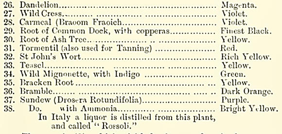 The preparation of the wool for weaving, and also the dyeing of it, was a matter which gave scope for much ingenuity, and I have made a list of the different dyes used, which may be interesting. Now the mineral dyes have superseded the native, which were as a rule vegetable, but alum, copperas, and urine were used to clean the wool and fix the colours.