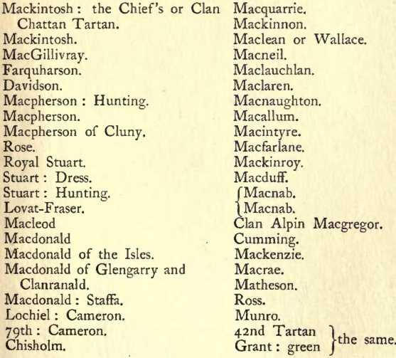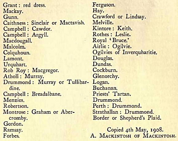The Mackintosh kindly sent me the list, and as—though undertaker much nearer our own time than Mr. Cockburn probably imagined—it was a genuine attempt on the part of a Highland chieftain to get to the bottom of the tartan question, it is well worth placing on record.