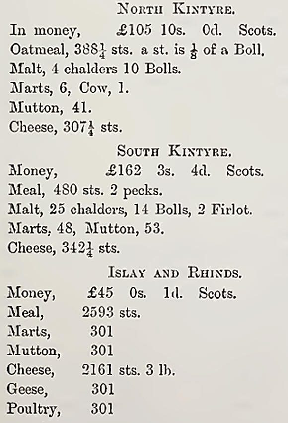 The rent book of a Highland chief in the olden time would be a very interesting study to day, with its payments in kind. In the old “Statistical Account’’ of Scotland, Dr. Smith, of Campbeltown, gives a most interesting statement of the rental of the district of Kintyre and Islay in 1542, then in the possession of the Lord of the Isles—