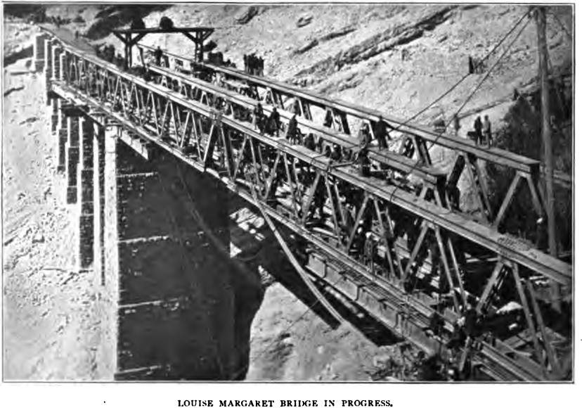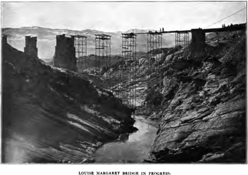 “Louise Margaret Bridge.—The tunnel completed, there remained the erection of the girder, and this is about 220 feet above the bed of the gorge. The erection of it was not the least of the difficulties overcome by the ingenuity and energy of General Browne and Captain Scott. This is the bridge which was opened by H.R.H. the Duchess of Connaught, the first lady, we believe, who ever visited the spot, and was named “ Louise Margaret ” in her honour. The elevation of the Chuppur Rift is about 5,300 feet or one mile above the sea; from thence the line rises with a ruling gradient of 1 in 45 till the summit level of 6,800 feet is jeached, first, however, passing through another very difficult point known as Mud Gorge. Here the difficulty is not rock, but a mountain mass which is little better than hard mud, which had already made several bad slips carrying away the whole of the line, and threatening more slips in the future. It will be some time before the regime of Mud Gorge will be thoroughly established, and the line attain a tone of durability.”