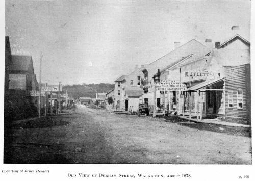 The village of Durham was the base of supplies for the first settlers who came into Brant. It was there they had to go for their mail matter, and also to have ground into flour the first grain grown on their small clearings, as well as to purchase their groceries and clothing. These inconveniences were partially overcome when in 1851 Messrs. Jardine & Valentine, having erected the building familiar to Walkertonians of the present day as "the old post-office," they there established the first mercantile business known to Walkerton. The building referred to was nearly opposite Joseph Walker's tavern. Between them a small stream of water flowed, which long since has disappeared. Shortly after the opening of Jardine & Valentine's store, John Shennan opened another, which was located on Willoughby's Hill, east of the river. In 1852 Shennan was appointed postmaster, the office being known as "Brant." It was the third post-office established within the county, the offices at Kincardine and Southampton having been established the preceding year. As Shennan was unacquainted with the duties of the office, he had Malcolm McLean, at that time engaged as a clerk with Jardine & Valentine, and who had experience in post-office duties, to open and send out the first mails from the office. Shennan after holding the office for about a year resigned, when Malcolm McLean received the appointment, dated 15th November, 1853, and has held it to this day, possibly the oldest postmaster in Canada. The name of the post-office was changed to "Walkerton," September 24th, 1857. The next to open places of business in Walkerton were John Bruce and James Jamieson. The former claims to have built, in 1853, the first frame building, and in 1859 the first brick building erected in the town.