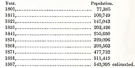 The population for 1887 is as estimated in connection with the Glasgow Boundaries Commission held in November and December, 1887. If to this be added the population of the suburban burghs, estimated at 187,122, we have a total population in the city and suburbs of 731,117. The rapid extension, with the increase of property, is lucidly brought out in the statement submitted by the Town Council to the Boundaries Commissioners, and published in the Glcisgoiv Herald, thus: “As a consequence of the increase of Glasgow, which since 1840 has proceeded in a manner probably unexampled in Great Britain, various suburbs have sprung up beyond the Parliamentary boundaries, and are in reality part and portion of the city. Although ample provision was believed to have been made by the Boundaries Commissioners of 1832 for future large extensions, the actual growth of Glasgow within the last fifty-five years has far exceeded the expectations of the Commissioners. It has pushed itself westward nearly 2 miles beyond the Kelvin, uniting itself to and going beyond the village of Partick; it has extended to the north-west, so as to include the village of Mary hill; while the district on the north, known as Possil, is being rapidly built over; the ground between Maryhill and Partick, to a distance of nearly 2 miles west of the Kelvin, known as the Hillhead and Kelvinside districts, is either already occupied or is being rapidly covered by the residences of the wealthier citizens. South of the Clyde, Glasgow has united itself to and gone beyond the village of Govan, and has extended over the districts known as Kinning Park, Pollokshields, Govanliill, Crosshill, Polmadie, Mount Florida, Langside, Shawlands, Cross-myloof, Strathbungo, and Bellahouston. As showing the increase of Glasgow within its municipal limits, it is stated (1) that while the population, as given in the report of the Boundaries Commissioners of 1832, was, in 1821, 147,043, and in 1831, 202,420, the census of 1871 shows it to have been 491,495, and the census of 1881, 511,415. At the present time (1887-88) it is estimated to be 543,995. (2) The report of the Boundaries Commissioners also gives the number of houses within the city in 1821 as 33,805, and in 1831 43,513; in 187172 they numbered 103,633; in 1878-79, 118,300; and in 1887-88, they are estimated to number 122,043. The rental of lands and heritages within the city cannot be given authoritatively previous to 1854, when the Valuation of Lands (Scotland) Act was passed, and for the first time established a uniform mode of valuation. In 1855-56, however, the valued rental was £1,362,178; in 1878-79 it was £3,418,322; and in 1887-88 it is £3,336,964. The population resident in the suburbs of Glasgow beyond the Parliamentary and municipal boundaries was estimated in 1878-79 to be 140,493; in 1887-88 it is estimated to be 187,122. The number of dwelling-houses in these suburbs in 1878-79 was estimated at 33,794, and in 1887-88 it is estimated at 41,040. The valued rental in 1878-79 was estimated at £901,152; in 1887-88 it is estimated at £1,058,516.”
