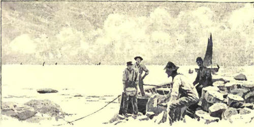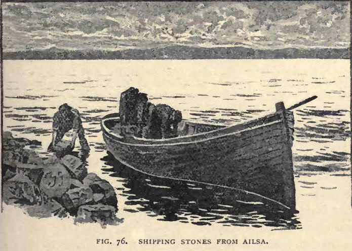 UT from the entrance to the Frith of Clyde stands "the craggy ocean pyramid" which John Keats, in that fine sonnet, apostrophised as he halted at the King's Arms Inn, Girvan, in the summer of 1818. But Ailsa Craig, still as deaf as when Burns told the tale of Keg and Duncan Gray, neither heard nor Heeded the questioner. About the very time that Keats wrote his sonnet Ailsa Craig was becoming known as "a place of arms" for curlers. As such it has become more and more popular. We are within the mark when we say that one-half of the curling-stones used in Scotland, and three-fourths of those furth of Scotland, have been taken from Ailsa. The chief equipment of the curler is his curling-stone. While the frost lasts, that stone is the dimidium animœ of its owner—aye, and more. It cannot but be interesting to a curler to know something as to how his chief equipment is itself equipped. In this belief we ask him to accompany us to the Craig, and follow the career of the stone. The origin of the rock itself we had better regard as a mystery, like the origin of the game of curling and of the Royal Club. Any answer to the poet's questions seems to open up awkward points. We are safe enough to believe that Hew Barclay of Ladyland tried to make Ailsa a fortified place, to help the cause of Spain and that for his treason he shared the fate of the Armada, or that the solan geese were its "inhabitants" as far back as 1549, when Dean Munro of the Isles wrote the first account of the rock. Beyond that the ground is dangerous. One tradition is that about the year 1000 A.D. the island belonged to the Irish king, Brian Boru. If so, pity the Marquis of Ailsa, the tenant, and the stone-makers! According to the Irish song: