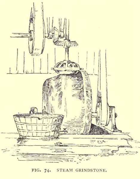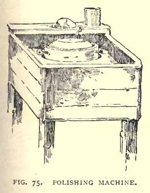 Enough of petrology and tradition. Let us begin with May 16, 1889, when, with Messrs Douglas and Thor-burn, we visited Ailsa, and heard the rock tell its own story. The Craig is rented from the Marquis of Ailsa by Andrew Girvan, who, for £30 a year, has the pasturage of the island, and a monopoly of the supply of stone. Under the charge of Andrew we left the town of Girvan, which is 9½ miles distant, and our boat drew up at the neat little jetty erected by the Northern Lighthouse Commissioners, in connection with the lighthouse which stands on a spit of level ground on the east side of the island. We found James Millar waiting there to receive us. James, whose profile is accurately given in the frontispiece of this chapter, is a man of great intelligence and physical power. He is the blocker-general in the curling-stone world, visiting Ailsa Craig for two or three months in the year, and then returning to Ochiltree, of which place he is a. native, to prepare the Burnocks. The majority of our curling-stones have come through the hands of James Millar. There is a knack in blocking the stones, as there is in most other things, and James has it. "You must have a good straight run in the boulder," says he; and from what we saw it is not easy to get. Once James gets it he soon divides up his subject into squares, leaving to one or two subordinates to chip the squares into such roundness as they are seen to possess in our drawings. ,latch-making among the Ailsa blocks is most difficult. Nature has joined them together, but not in "happy pairs." It is under the hands of James Millar that like is drawn to like. James is Mormon in his match-making. When he Gets a block with some sweetness and regularity in its disposition, he numbers it, say "38" or "39," as the case may be, and then selects five, tell, or twenty companions for it, giving them all the same number, to show their similarity, and leaving the pairing process to the manufacturer. There are, as all curlers are aware, three kinds of Ailsas—the Blue hone, the Red Hone, and what is called the Common Ailsa. The last, as its name implies, is most plentiful. The Red is scarce, and getting scarcer every year. At the time of our visit workmen were busy blasting a seam of this variety on the north side of the island, about 200 feet above the sea. One of the men, bound by a rope, descended the precipice, inserted a blast, and was then pulled up. When the blast came off the dislodged stone was dashed down on the shore and broken into fragments. It is the difficulty of getting it that makes the Red Hone so dear. James Millar unhesitatingly places the other varieties before it, and gives the Blue Hone the highest place among the Ailsas. The prices of these blocks put on the rail at Girvan run from 3s. 6d. to 9s. per pair, the highest price, of course, being paid for the Red Hone. At a cost of about 10s. per ton, or about 2s. per pair, the blocks are carried by railway to the principal manufactories in the west country. In the workshop the block is first of all cheesed, i.e., chiselled into the shape of a gouda cheese. The stone is thereafter bored. When it has been properly swung and balanced, it passes into the hands of a workman with a teethed hammer, who gives it a rough finish all round, and then rolls it off with a mould, and prepares it for the grinding machine. The cost of this machine is about 120. It is in two parts. The curling-stone, in a cup at the base of a vertical, is whirled round at great speed by the upper belt operating on two meeter-screws, and held firmly on a Nitshill grindstone driven in an opposite direction by the lower belt, as shown in our drawing. The stone is reduced and roughly polished by this process. In making the concave sole, the stone, instead of being allowed to run in a hollow, is run upon a raised ridge—A, in the grindstone In ordinary grinding, the stone, by means of a lever which raises the cup, can be taken out, and another inserted without stopping the machine. In grinding the concave sole both parts of the machine are, however, slowed in case any injury should be done to the running; ride of the stone—a matter of the greatest importance, for no stone can run correctly when this delicate ridge is in any way impaired. On its removal from the grinding machine the curling-stone, which is now quite respectable in appearance, is fixed in another cup set in a frame, as shewn in Fig. 75, and is then driven round at tremendous speed by a belting which operates underneath. The honing process is now begun; rough freestone, then Crakesland stone, and finally Water of Ayr hone being successively applied by the hand to both sides. To the one side or sole no more is now done. This is the dull side. To the other side polishing putty is applied on flannel held firmly on the heated stone by a wooden lever. This is the keen side. Don't be impatient. The stone is not yet finished. A rough ridge runs round the circumference, which must be reduced. With a diamond two zones are drawn, and this ridge is chiselled into a neat belt. Neither under nor above but upon this belt the channel-stane is destined to receive all its "plagued-knocks." Now let us have an iron bolt, with a round or a square head, and a screw on the other end to meet the screw of the handle, a washer, and finally a handle none of your gew-gaws of ivory and silver, but one of plain brass; not too much of a swan-neck, but rather square, with heck and grip about the same thickness. We screw the handle firmly on the bolt, having previously numbered their that the one may know the other and give us no further trouble. With his chief equipment fully equipped, at a cost of from 30s. to 50s., according to the material used, the curler may now take his place on the ice. Not, however, without a broom, and that "neatly tied." Let him respect that old Dunblane rule. 'When the majority of our curlers have provided themselves with housemaids' besoms, we may bring thes