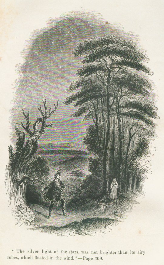 Leaning on the shattered stump of an old tree, he fixed his eyes on the far-stretching plain, which alone seemed to divide him from the venerable Sir Ronald Crawford, and his youthful haunts, at Ayr. Full of thoughts of her who used to share those happy scenes—he heard a sigh behind him. He turned round, and beheld a female figure disappear amongst the trees. He stood motionless: again it met his view: it seemed to approach. A strange emotion stirred within him. When he last passed these borders, he was bringing his bride from Ayr! What then was this ethereal visitant? The silver light of the stars, was not brighter than its airy robes, which floated in the wind. His heart paused—it beat violently—still the figure advanced. Lost in the wildness of his imagination, he exclaimed, "Marion!" and darted forwards, as if to rush into her embrace. But it fled, and again vanished. He dropped upon the ground in speechless disappointment.