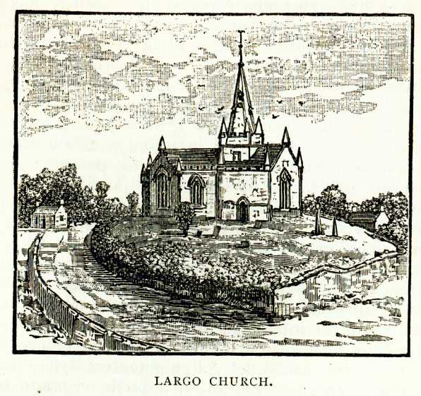 The Parish Church, according to the New Statistical Account, "was built in 1817 and in 1826, there was taken into the new building, an aisle belonging to the old, by which the spire is supported, bearing date 1623. It affords accomodation for upwards of 800." On one of the inner walls there is a slab, which records, in Latin, that:- "This church was first erected about the year 1300, in the reign of Robert the Bruce, enlarged about the year 1400, ornamented with a spire in 1623, again enlarged about 1688, and finally enlarged and decorated in the year 1817." The inscription also preserves the names of the heritors, minister, and architect, who rendered themselves famous by the operations of 1817. As will yet be shown, the church was first erected long before the year 1300. The chancel and steeple are all that have been spared of the old building; but even these seem to be comparatively modern. The spire is dated 1628; and the chancel, which has been barbarously plastered both outside and inside, has a panel, over the window, bearing the motto, "Fear God," the date 1623, and the initials "P. B.," while the arms are wasted away. The bell is dated 1636; but it is worth no one’s pains to climb the steeple, as an outlook can only be had through a small aperture. So determined have the renovators been to hide the old work that a ceiling has been inserted under the vaulted roof of the chancel; but while they could spare funds for this, they economised their cash by putting in wooden mullions ! This is the building which in Chambers’ Gazetteer of Scotland is described as "an ancient Gothic fabric, with a spire rising from the middle!" The writer must have gazed at it from a distance, for, though it is a pretty, neat erection, and picturesquely situated, a glance at the masonry shows that it is modern. There are few, if any, stones of interest in the burying-ground; but that is more than made up by the great number of mural marble monuments in the church. Among others commemorated, are General and Admiral Durham, their father and mother, their nephew, Thomas Calderwood Durham, and their niece, Lilias Calderwood Durham, "the last of her race." There is also a tablet in memory of Sir John Leslie, the distinguished mathematician and Professor of Natural History, who was born in Largo in 1766, and died at Coates, in Newburn parish, in 1832. Another native, James Kettle, who lived to the good old age of 92, and left £600 to the care of the Kirk-Session, is likewise commemorated; and so are several other prominent men more or less connected with the parish. While these stones are conspicuously displayed on the walls, the monument of Sir Andrew Wood’s descendants is allowed to lie ingloriously in the floor under two pews! The old church was granted to the nuns of North Berwick hy Duncan, Earl of Fife, and Earl Malcolm, his son, confirmed the grant. William the Lion, in confirming their grants to these nuns, specially mentions the Church of Largach. It was dedicated by Bishop Bern-ham on the 16th Kal. of August 1243. Alexander Wod was vicar here immediately before the Reformation. Reference has already been made to him, and one of his illegitimate daughters, on page 43. On the 10th of March 1559, a marriage was contracted betwixt Alexander Carrik, "ane honorabill man," and Alisone Yod, "dochter naturall" to "Maister Alexander Vod, vicar of Largow." At the "handfasting," Carrik, his brother, and the vicar were present, and signed a contract of the marriage, which was to be solemnised between that date and the midsummer following. The vicar delivered £20 at the handfasting, £40 was to be forthcoming at the marriage, and another £40 within a year and a day after the marriage. On the 13th of March, Jhone Spens, a burgess of North Berwick, became surety and debtor for the £80 to Carrik. Of that sum £30 was to be given by Dame Margaret Hume, Prioress of North Berwick, and the remaining £50 by Wod. The Prioress and the vicar bound themselves to relieve Spens. The shameless profligacy of such men did much to ripen public opinion as to the necessity of reformation. Those who wish to see the form of handfasting fuller than it is in the above summary will find it in the Carte Momalium de North-berwic. In 1597, Parliament dissolved the kirks of Largo and Kilconquhar from the Abbey of North Berwick. John Auchinleck was minister here from 1592 to 1619, and was succeeded by his son Andrew in the following year, who was translated to Dundee in 1642. James Fairlie, formerly Bishop of Argyll, was thereafter presented, but was not received. This unlucky wight was consecrated as a Bishop only two days before the tumult about the liturgy, which led to the entire overthrow of the Hierarchy. James Makgill was ordained at Largo in 1644. Lamont relates several curious incidents that happened during Makgill’s incumbency. The Commission of the Kirk appointed a fast to be kept through the Kingdom, immediately before the coronation of Charles the Second. This fast was observed at Largo on the 22d and 26th of December 1650. On the second day the minister read the causes of the fast, which were the sins of the King and his father’s house; and the Earl of Lauderdale publicly acknowledged the sinfulness and unlawfulness of the Engagement, his sorrow and remorse for having acceded to it, and his resolution to beware of such courses in future. Makgill then read the Solemn League and Covenant, and Lauderdale holding up his hand sware it. The Kirk-Session gave him a certificate bearing that they were well satisfied with his repentance. Little did they know the man they had to deal with! In 1662, Parliament ordained that all persons in public trust should take a Declaration, in which it was affirmed, inter alia, that the Solemn League and Covenant was an unlawful oath, imposed and taken against the fundamental laws and liberties. Sir George Mackenzie, in his Memoirs of the Afairs of Scotland, says, that the great design of t