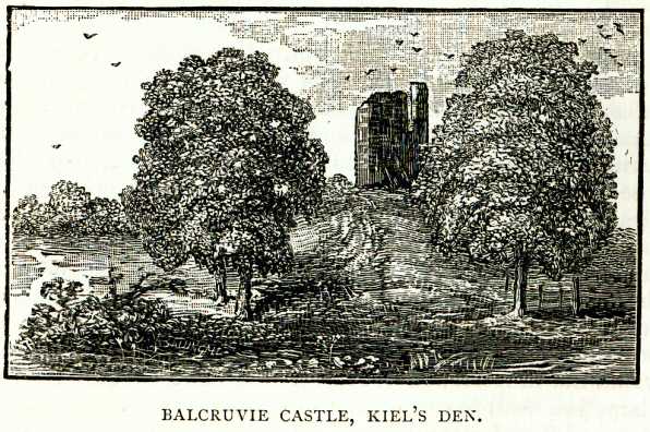 Pitcruvie Castle is picturesquely situated on the verge of the upper portion of Kiel’s Den. It is sometimes called Balcruvie. The most direct way to reach it, and the easiest way to find it., is to take the road which leads from Largo to Ceres. It. is so conspicuous, with the romantic den on the one side and a prosaic farm-steading on the other, that it cannot be missed. The walls are wonderfully entire, but the stones are very weather-worn. It has been a great massive keep, much the same as Scotstarvit Tower, near Ceres. Two of the flats have had vaulted floors, and the remains of the circular tower, which contained. the stair-case, can still be seen at one of the corners. This tower seems originally to have been corbelled out, and to have been afterwards supported from the ground. Near another corner the foundation of the stair can be seen which led to the first flat. The two vaulted chambers, on the ground floor, must have been used as dungeons, or store - houses, as the only entrance was by a trap-door from the room over-head. It is said that the castle belonged in ancient times to the Ramsays, and that a daughter of that family married David, second Lord Lindsay of the Byres, who was distinguished for his bravery in foreign wars, and for his devotion to James the Third. According to Pitscottie, Lindsay gave that monarch his "great gray courser," which, "if he had ado in his extremity, either to flee or follow," was able to "war all. the horse of Scotland, at his pleasure, if he would sit well." The King, however, was not able to "sit well;" and so, in his flight from Sauchie Burn, he fell off the great gray courser at the fatal Beaton’s Mill. Pitscottie also tells how Lindsay and the others, who had assisted James the Third, were summoned to appear at Edinburgh, and records the bold but informal speech of Lord David, who was "a rash man, of small ingyne and rude language, although he was stout and hardy in the fields." The Chancellor craftily advised him to submit to the will of the King; but David’s. brother, Patrick, who was versed in the law, tramped on his foot as a hint that he should not. Unfortunately, he had a sore toe, and "the pain thereof was very dolorous," and so he angrily exclaimed:- "Thou art over peart, lown, to stramp on my foot, were thou out of the King’s presence, I should take thee on the mouth!" Patrick, seeing that the case was desperate, fell on his knees and craved leave to plead for his brother. When his desire was granted, he managed, by pointing out first one informality and then another, to remove the King from the bench, and to induce the Lords to "cast the summons." Lord David was so delighted now with his brother, that his gratitude thus burst forth:- "Verily, brother, you have fine pyet words, I would not have trowed that you had such words. By St Mary, you shall have the Mains of Kirforther for it!" The Mains of Kirkforthar was a poor recompense; for the King was so displeased at Patrick, that he declared, "He should gar him sit where he should not see his feet for a year;" and he kept his word. Lord David died in 1492, and was succeeded by his brother John, who died without male issue in 1497. .At the latter date, Patrick, of the "fine pyet words," became fourth Lord Lindsay of the Byres. He accompanied James the Fourth to Flodden, and advised that the King should not hazard himself in the battle, at which James was so furious that he vowed, he would "cause hang him on his own gate," when he returned to Scotland. As one of Lord Patrick’s sons, who died before him, was styled Sir John Lindsay of Pitcruvie, it has been inferred that the estate had passed into the hands of the Lindsays by the marriage of Lord David. In his History of Fife, Leighton expresses the opinion, that it was Sir John, who acquired the lands of Pitcruvie by marriage, and built the castle. Leighton also states that Pitcruvie was sold to "James Watson, Provost of St Andrews, whose grandson, James Watson, was served heir to him in the lands of Pitcruvie, Auchindownie, and Brissemyre, on the 8th of March 1664."