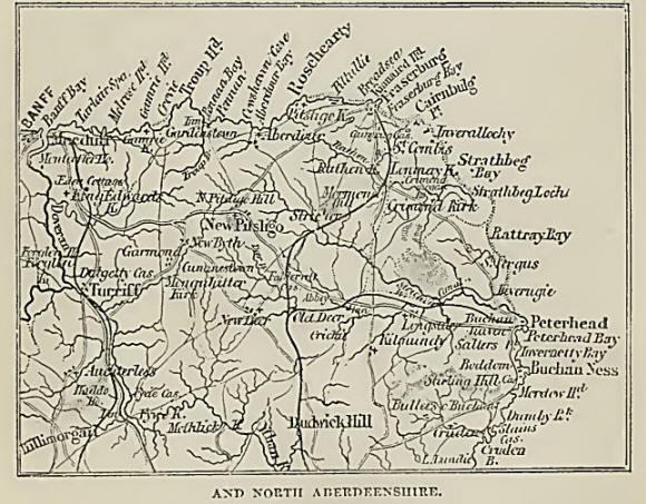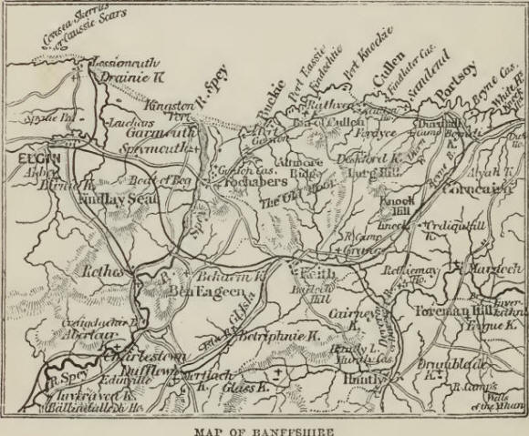Having referred to the coast-line, we may also briefly refer to the inland portion of the county. Banffshire is of an irregular shape; and extends from the southern shores of the Moray Firth in a south-westerly direction toward Cairngorm and Ben Macdhui—the highest mountain knot of the Grampians. The middle portion of the county is moderately hilly. Glen Fiddick, Glen Isla, and Strath Deveron follow the line of hills which descend in a north-westerly direction from the Grampians toward the sea.