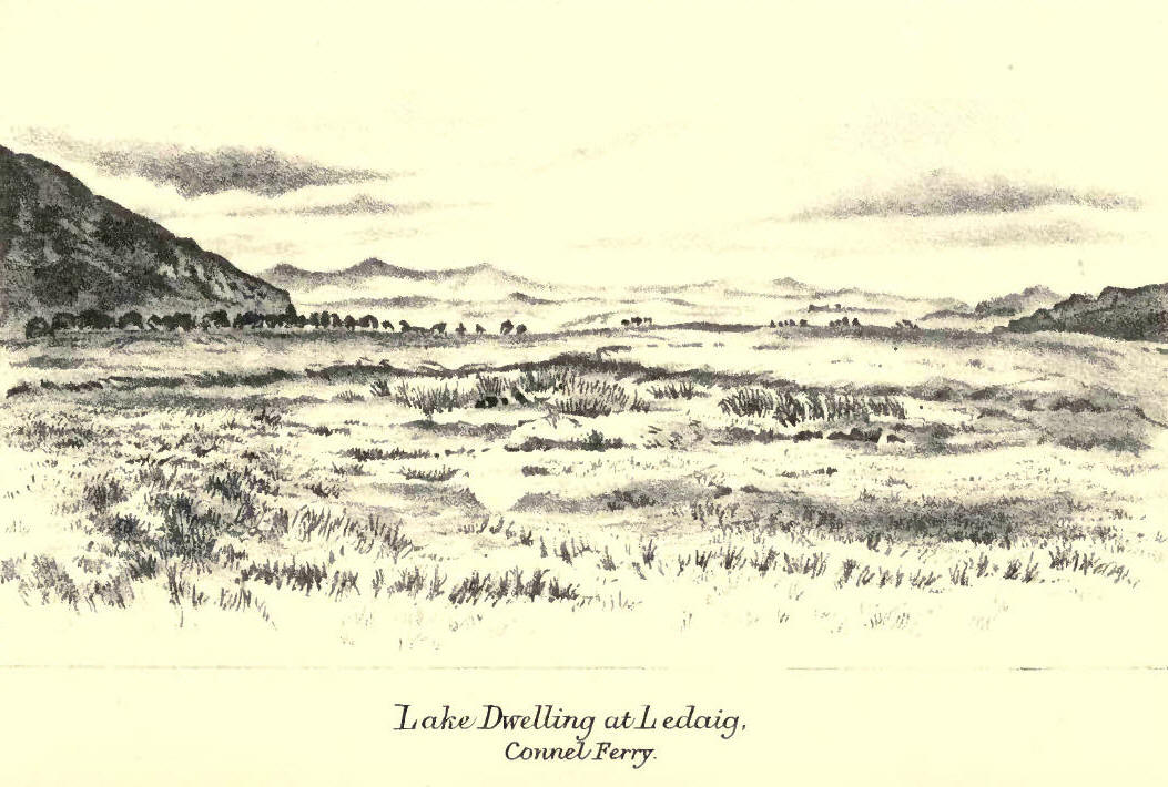 No piles were seen. There were many leaves, half rotten, and a few branches. The young trees had been felled with sharp axes ; there was none of the clumsiness of the stone age. The encircling mounds were but a few inches high, but they showed organic matter decaying and turned into peat. It seemed as if a double wall of wattles had existed, it might have been peat or grassy turf. I saw no proof of clay to fill up the chinks: the Highlanders do not object to chinks even now.