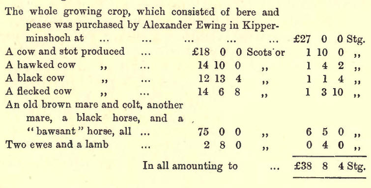 Alexander Chalmers, who was the tenant of Succoth farm, died bankrupt in 1735, when, owing to the need of realising the stock for the benefit of the landlord, it was disposed of by public roup, with the following result:—