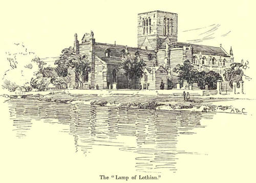 LUCERNA LAUDONIAE, the Lamp of Lothian, as Fordun in the fourteenth century styled the beautiful abbey church of Haddington—a felicitous appellation that has in a manner clung to it for all time—is the only spectacular attraction Haddington offers to the casual visitor. It is of cruciform design, fashioned of rich red freestone, which, a tradition similar to that associated with many other mediaeval edifices maintains, was brought from Garvald, six miles away, by passing it stone by stone along a line of men. The church, of Gothic style, is all that remains of a Franciscan monastery founded in the thirteenth century. The nave measures 200 feet from end to end, the transept about half as much, and there is a fine massive central tower 90 feet high. The western portion of this beautiful building has been always used as the parish church. The rest of it was in the hands of the workmen on a recent visit. It rises above a large well-shaded graveyard outside the town, and near the banks of the Tyne, altogether a site in harmony with its stately proportions and its abounding memories. Whether it was gutted by the English during Hertford's raids in that singular interlude between the English and Scotch reformations, when the former, figuring as Protestants, threw down the altars of Lowland papists, or whether the Scotch reformers, in their iconoclastic orgies after 1559, took the chief hand, I do not know. There seem to have been at one time
