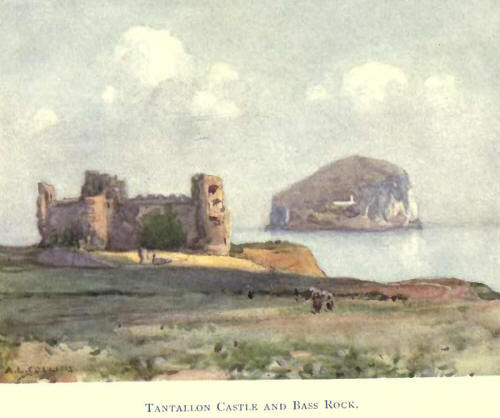 The shape of the rock, which rises 320 feet out of the waves, is singularly imposing, and its sides are wholly precipitous, save where its broad back shelves down into the sea at the landing-place. The interests are manifold, and cover the centuries. Zoologically the thousands of solan geese or gannets, which have found an immemorial home in its inaccessible cliffs, make the rock in this particular unique. In old times these birds were accounted a delicacy, figured upon the tables of kings, and fetched a high price in the market, though rejected by the modern palate. The education of the young birds is conducted on heroic principles. Stuffed to repletion by the parents with poddlies, a species of cole-whiting which abounds in these seas, they become encased in a thick coat of fat, and in due course are hefted unceremoniously out of their nest, to fall into the sea below. Here they are supported without upon the waves, and nourished within by their own obesity, till their wings and natural instincts develop sufficiently to start life in earnest. The birds, with whose nests the cliff ledges are crowded in the breeding-season, are of course protected, the rock being private property. Its history commences, like that of most such storm-beaten islands, with a sixth-century saint—in this case St. Baldred, of notable name among the missionaries of the north. He is said to have died here, and considering that to this day the lighthouse people are sometimes confined to the Rock for weeks together, one can well believe that this one, like so many others on the coast of Britain, received the parting breath of the saints who frequented them. Local nomenclature on the mainland still recalls the wonder of St. Baldred's miracles. The Bass is indelibly associated, and for all time, with the name of the famous family of Lauder. Though so prolific and tenacious a breed that I have seen somewhere a list of thirty and odd estates in South-Eastern Scotland, held in old days by different branches of the stock, the Lauders of the Bass stand apart and by themselves, being also—though I tremble as I make this statement, so ramified is the Lauder lineage—identical with the Lauders of Lauder, whom we shall meet anon. The first Lauder of the Bass became so by virtue of his heroic support of William Wallace, the Rock being granted him by the Bishop of St. Andrews, together, no doubt, with that territory on the mainland which his descendants held with it. His son was a devoted follower of Bruce, and was one of the plenipotentiaries who signed the treaties both of 1323 and 1327. The family kept a grip of it, rejecting the money overtures, and defying all other attempts of the Stuart kings to get hold of it, till very near the time when it was purchased for the Crown in the reign of Charles II. Valueless financially but for the gannets, it must have been strategically a fine asset to a Scottish family in the everlasting struggle to keep place and property. A chronicler of the house tells us that the family only summered there in times of peace, living otherwise upon the mainland. They were all buried in the old church of North Berwick, which has been gradually consumed by the sea, till now there is but a fragment of it left upon the sand. A flat stone in the centre of the green, near the old almost vanished twelfth-century church, still marked the hereditary burying-ground of the Lauders of the Bass eighty years ago, since which the encroaching sea has obliterated the spot.