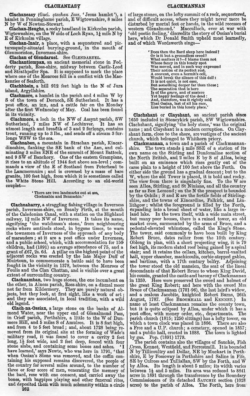 Clachaneasy, Clachan-Heughs, Clachan-Inair, Clachan of Glendaruel, Clachantiompan, Clachbhein, Clackmore, Clachnaben, Clachnaharry, Clachnamban, Clach-na-Ossian, Clachshant or Clayshant, Clackmannan