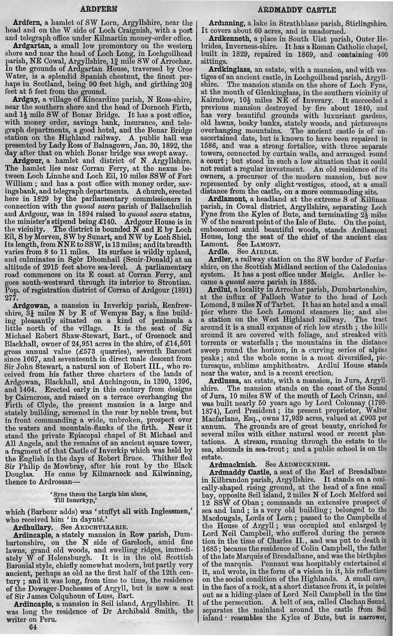 Ardfern, Ardgartan, Ardgay, Ardgour, Ardgowan, Ardhullary, Ardincaple, Ardinning, Ardkenneth, Ardkinglass, Ardlamont, Ardle, Ardler, Ardlui, Ardlussa, Ardmacknish, Ardmaddy Castle