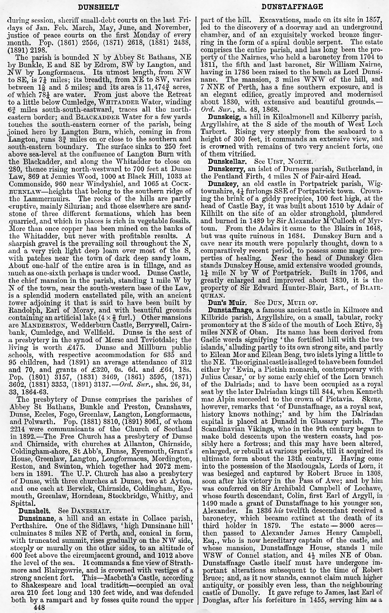 Dunshelt, Dunsinane, Dunskeig, Dunskellar, Dunskerry, Dunskey, Dun's Muir, Dunstaffnage