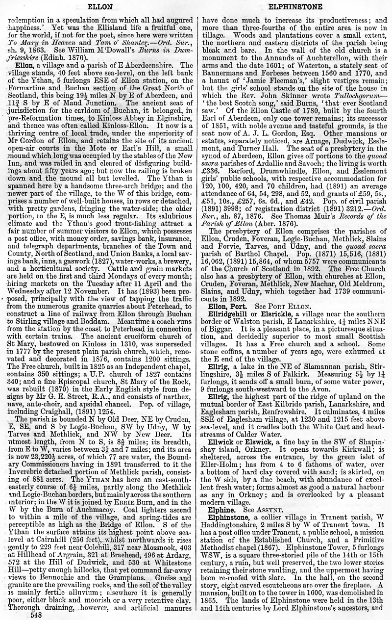 Ellon, Port Ellon, Ellridgehill or Elsrickle, Ellrig, Ellwick or Elswick, Elphine, Elphinstone