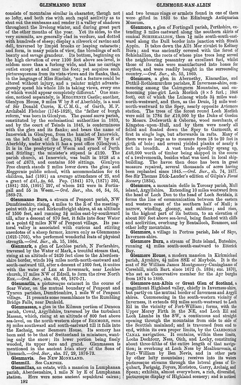 Glenlyon, Glenmanno Burn, Glenmark, Glenmarlin, Glenmassan, Glenmavis, Glenmill, Glenmillan, Glenmore, Glenmore Burn, Glenmore House, Glenmore-nan-Albin or Great Glen of Scotland