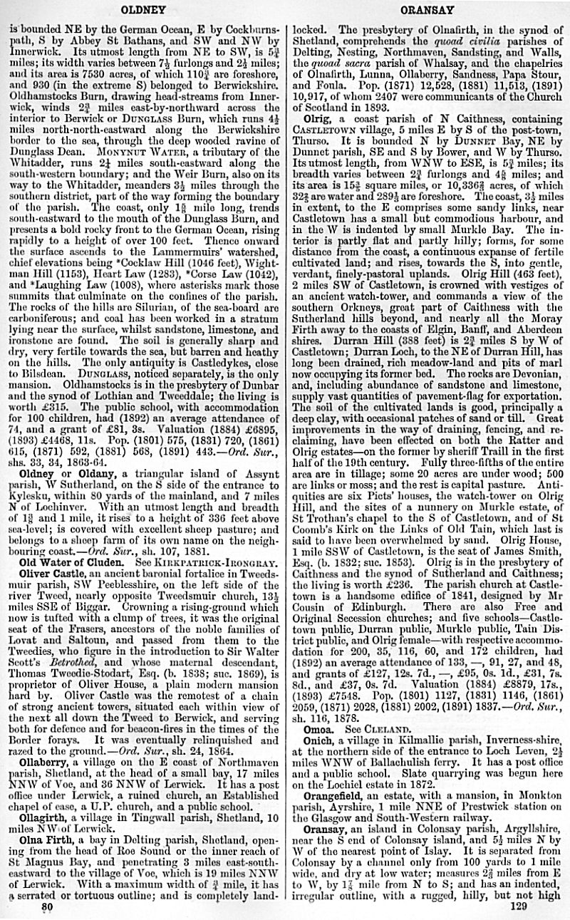 Oldney or Oldany, Old Water of Cluden, Oliver Castle, Ollaberry, Ollagirth, Olna Firth, Olrig, Omoa, Onich, Orangefield, Oransay