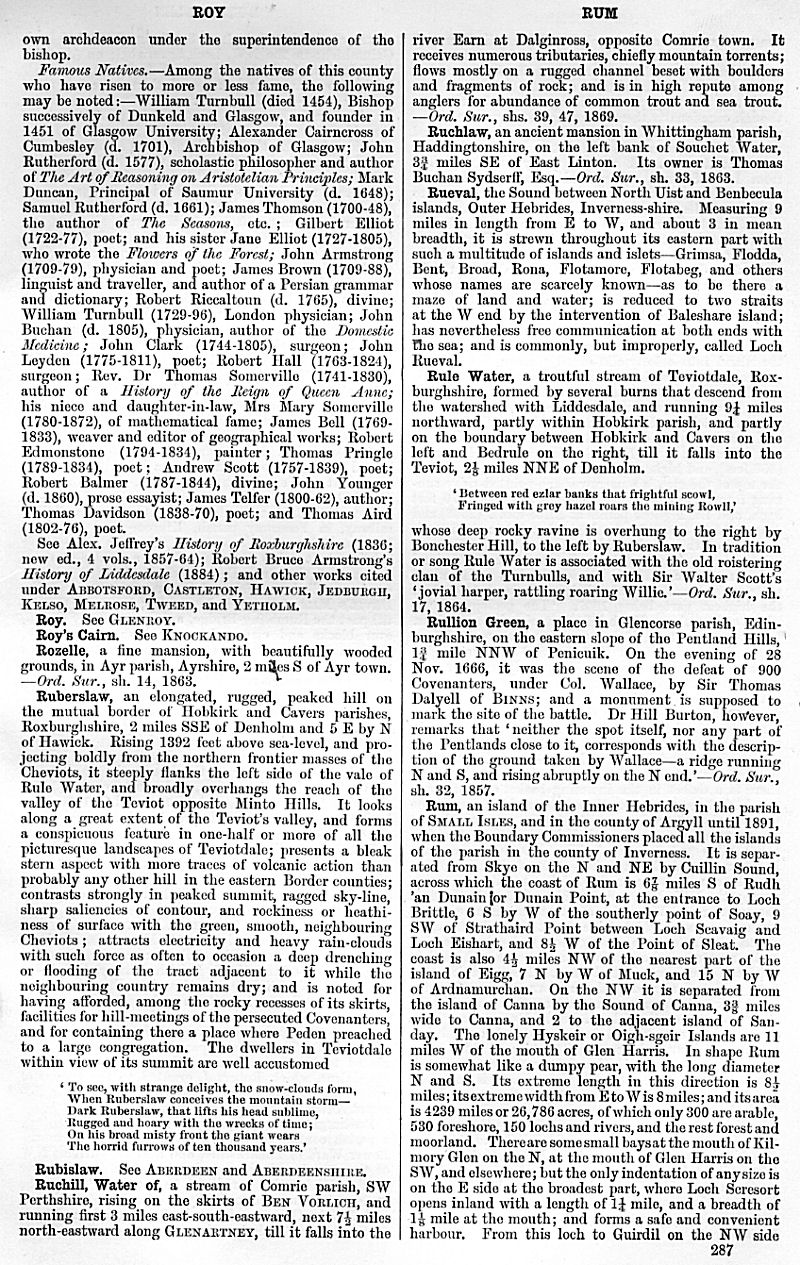 Roxburghshire, Roy, Roy's Cairn, Rozelle, Ruberslaw, Rubislaw, Water of Ruchill, Ruchlaw, Rueval, Rule Water, Rullion Green, Rum