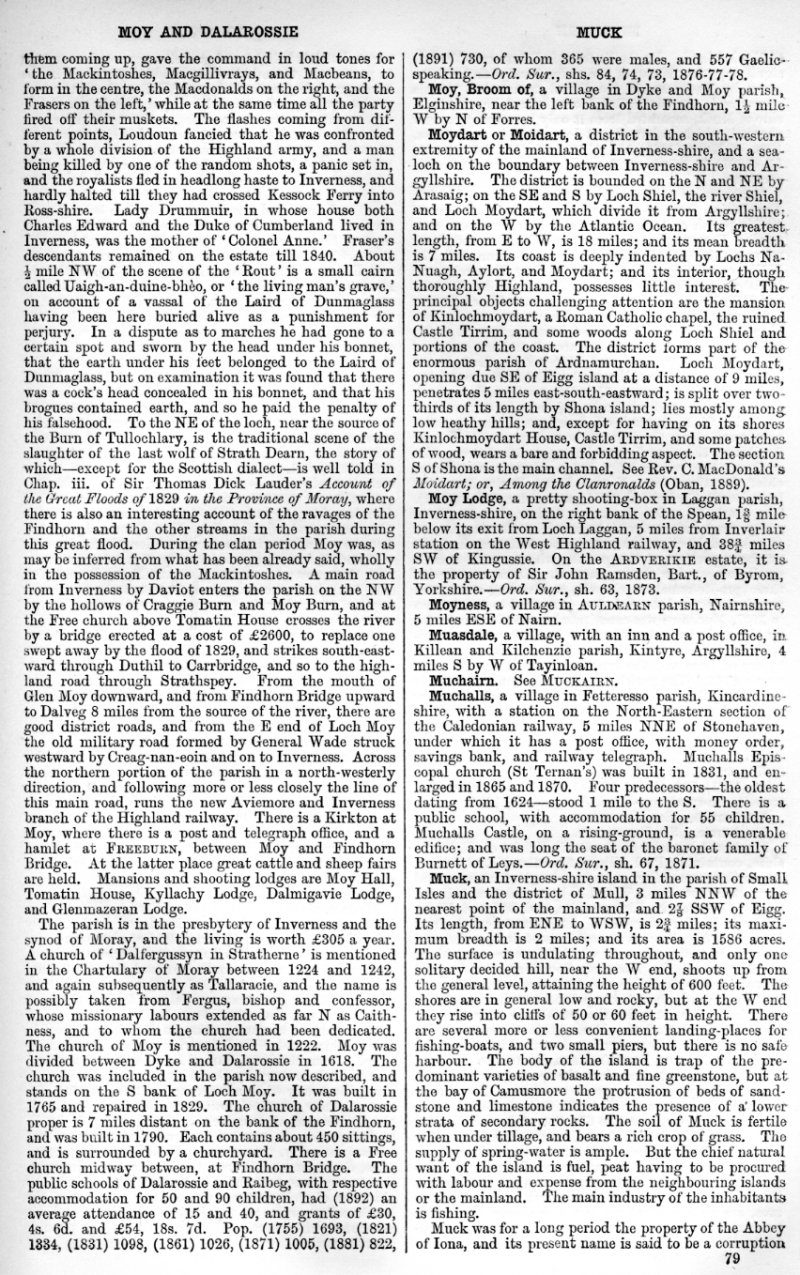 Moy and Dalarossie, Broom of Moy, Moydart or Moidart, Moy Lodge, Moyness, Muasdale, Muchairn, Muchalls, Muck