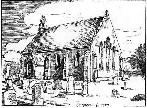 Upon the west side of the valley, high above the river, about five miles from Ballantrae, stretches, like a white ribbon on the green hill side, the village of Colmonell. The village is named after the Saint to whom the church was dedicated in Roman Catholic times. What the early Parish Churches were like we do not know; but the present church, as may be seen by ihe drawing, is handsome enough, and forms an outset to a village which is not deficient in charms of its own There is a Free Church here as well, and a very handsome Public Hall, while right across the valley stands, on its limestone rock, the sturdy old keep of Craigfieil, and the ruined walls of Kirkhill Castle keep guard at the entrance.