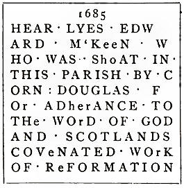 It is thus Wodrow tells the story:—"On the 28th of February, about 11 o'clock at night, Cornet Douglas, with 24 soldiers, surrounded the farmhouse of Dalwine (still standing about four miles above Barr village). There they apprehended David Martin, who dwelt in the house with his mother; and finding Edward M'Keen (the name is spelled Kyan by Wodrow), a pious young man from Galloway, lately come thence to buy corn, who had fled in betwixt the gable of one house and the side wall of another, they dragged him out, and took him through a yard. He was asked where he lived, and he told them, upon the water of Minnoch. When one of the soldiers had him by the arm dragging him away, without any warning, farther questions, or permitting him to pray, Cornet Douglas shot him through the head, and presently discharged his other pistol and shot him again in the head; and one of the soldiers of the party, coming up, pretended he saw some motion in him still, and shot him a third time. He was but a youth, and could not have been at Bothwell or any of the risings, and they had indeed nothing to charge him with but his hiding himself. When they had thus dispatched this man, the soldiers brought out their other prisoner, David Martin, to the same place, and after they had turned off his coat, they set him upon his knees beside the mangled body. One of the soldiers dealt with the Cornet to spare him till to-morrow, alleging they might get discoveries from him, and stepped in betwixt him and six soldiers who were presenting their pieces. The Cornet was prevailed with to spare him, and bring him into the house. But the fright and terror so unhinged his reason, that he became an imbecile to the day of his death." Such were the doings that were common in "the killing time." And the only grim satisfaction we have is in learning that this ruffian officer, who had previously shot John Semple at Dailly, was himself cut down, four years afterwards, on the field of Killiecrankie.