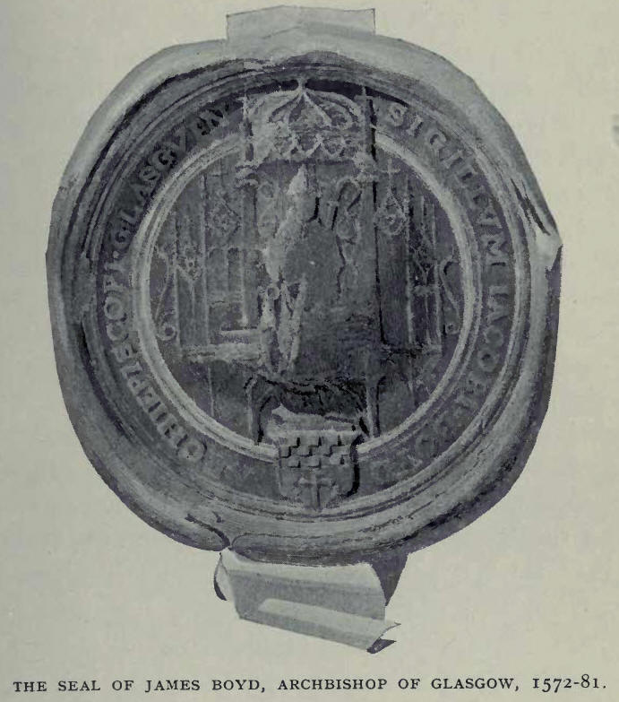 Porterfield's only intromission with the affairs of the archbishopric appears to have been his consent, on 10th October, 1571, to the conveyance of the parsonage house of Glasgow, with its garden, sloping down to the Molendinar on the east side of the Bishop's Castle, by the rector or parson, Archibald Douglas, to the redoubtable Thomas Crawford of Jordanhill, the capturer of Dunbarton Castle a few months earlier.[Great Seal Register, iii. p. 540, No. 2068.] The licence for Porterfield's election was only issued on 8th February following, and he seems almost immediately to have retired into private life and his parish on Loch Lomondside again, for at the parliament held at Edinburgh in January, 1572-73, Episcopacy was established in the Scottish Church, [Spottiswood, p. 260; Tytler, iii. chap. xi.; Cunningham, i. 341-346.] and in the September following, James Boyd of Trochrig, minister of Kirkoswald, was made Archbishop of Glasgow.
