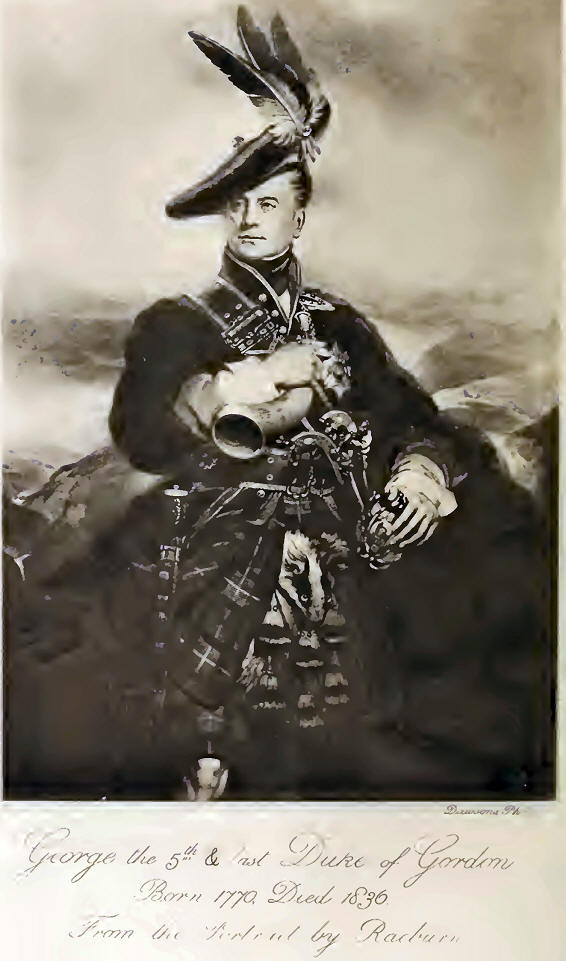 As the old proverb has it, “The sleeping fox catches no poultry,” and if one might venture with “bated breath to point a moral and adorn a tale,” it would be to whisper that the example of the “noble Jane,” as regards early rising and busy habits in the matter of farming, might with advantage be followed to a greater extent, not only by farmers and “farmeresses,” big and small, but by many young men and maidens in the Highlands in the present day. The Duchess died at London in 1812, survived by her husband, Alexander, the fourth Duke of Gordon, a son, and five daughters. A noteworthy fact in the life of Duke Alexander is that he enjoyed the honours of the family for the long period of seventy-five years—namely, from 1752 down to his death in 1827—a fact probably unexampled in the annals of the Scottish peerage. The family estates were at one time of vast dimensions, extending as they did from sea to sea, winding across the entire breadth of the country between the Atlantic and the German Ocean. In the last century a learned historian of the family dedicated the first of his two volumes to Duke Alexander in the following terms: “To the High, puissant, and noble Prince Alexander, Duke of Gordon, Marquis of Huntly, Earl of Huntly and Enzie, Viscount of Inverness, Lord Gordon of Badenoch, Lochaber, Strathavin, Balmore, Auchindoun, Gartly, and Kincardine.” The greater portion of Badenoch then belonged to the family, and the kindness and liberality extended to the people of the district by Duke Alexander during his long and beneficent sway, and subsequently by his son (the fifth and last Duke), were nothing short of princely in their munificence. The beautiful verses composed on the occasion of the death of Duchess Jane, by the venerable Mrs Allardyce of Cromarty, are worth quoting:—