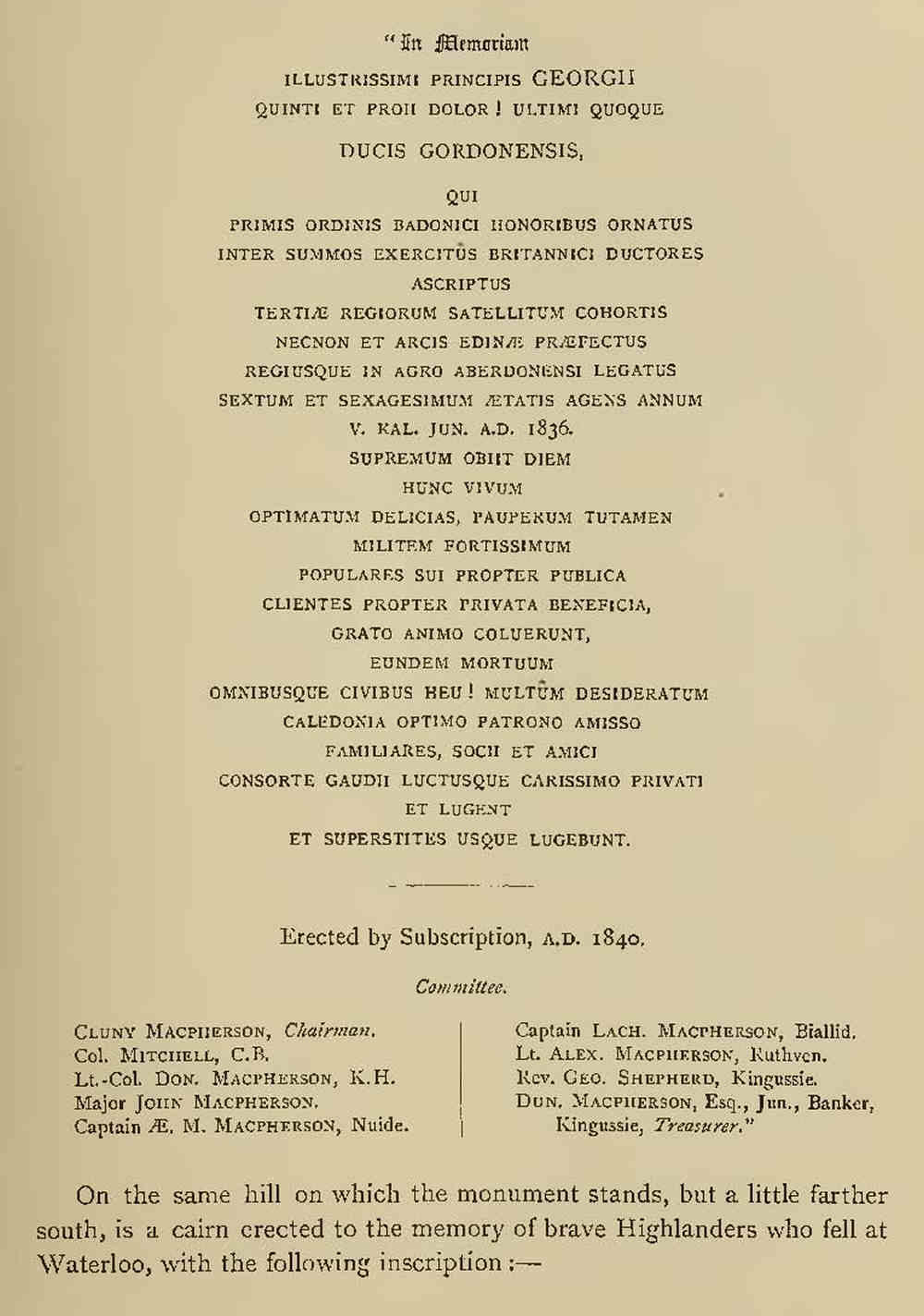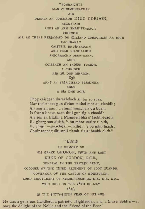 On the summit of Kinrara Hill is the monument to the last Duke of Gordon, a landmark seen far and wide, with the following inscriptions in Gaelic, English, and Latin, viz.:—