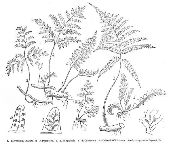 We repaired to the fernery. The powdery appearance, firmer growth, and more erect habit, coincided with the description of the Limestone Polypody. (P. Calcareum, fig 4.) Upon a drier and more sunny spot in the fernery, I remarked the curious little Ceterach or Scaly Spleenwort. I recognised it as a familiar ornament of a certain old wall in Devonshire, and was pleased to see it on the present occasion, because my new book placed it next to the Polypodys in order. Whether the masses were wholly naked, and the ragged morsels about them belonged only to the scales with which the back of the leaflets was so freely covered, or whether they were the remains of rent covers I could not decide, so contented myself with placing it with my Polypodys. (Ceterach Officinarum, figs. 5 and 5.)