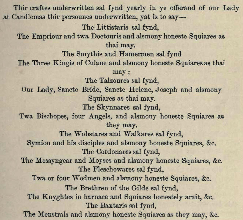 30th January, 1505.—The said day, it was fundin by the aid lovabile consuetud and rite of the burgh, that in the honor of God and the blissit Virgin Mary, the craftismen of the samyn, in thar best aray, kepit and decorit the procession one Candilmes day yerlie; quhilk auld and louable consuetud, the prouest, baillies, and counsale, riplie avisit, ratifeit, and approvit the said rite; and atour statut and ordanit that the said craftismen and their successoris, sale perpetualie in tyme to cum, to observe and keipe the said procession, als honorabily as they can: and they sale, in order to the Offering in the Play, pass tua and ij togidr socialie; in the first the tlesseris, barbouris, baxturis, cordinaris, skineris, couparis, wrichts, hat makars and bonat makars togidr, walcaris, litstaris, wobstaris, tailyeouris, goldsmiths, blacksmiths, and hammermen; and the craftismen sal furnys the Pageants; the cordinaris, the Messing; wobstaris and wolcaris, Symeon; the smyths and goldsmiths, iij Kingis of Cullane; the listaris, the Emperor; the masons, the Thrie Knichts; the talyouris, our Lady, Sanct Brid, and Sanct Elene; and the skynners, the Tua Bischopis; and tua of ilke craft to pass with the pageant that thai furnyss to keip thair geir ; and gif ony persone or persouns happinis to failze and brek ony poynt befor writin, and beis convictit tharof, sale pay xl sh. to Sanct Nicholas werk, and the balzeis unlaw unforgiven : ande to the obseruing and kepiug of the samyn, ale the said craftismen was oblist, be thair handis uphaldin.